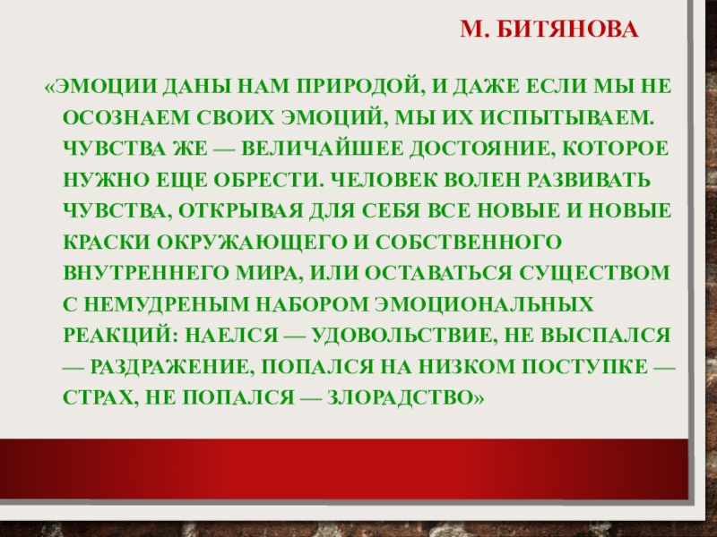 СВОИХ ЭМОЦИЙ, МЫ ИХ ИСПЫТЫВАЕМ. ЧУВСТВА ЖЕ — ВЕЛИЧАЙШЕЕ ДОСТОЯНИЕ, КОТОРОЕ НУЖНО ЕЩЕ ОБРЕСТИ. ЧЕЛОВЕК ВОЛЕН РАЗВИВАТЬ ЧУВСТВА, ОТКРЫВАЯ ДЛЯ СЕБЯ ВСЕ НОВЫЕ И НОВЫЕ КРАСКИ ОКРУЖАЮЩЕГО И СОБСТВЕННОГО ВНУТРЕННЕГО МИРА, ИЛИ ОСТАВАТЬСЯ СУЩЕСТВОМ С НЕМУДРЕНЫМ НАБОРОМ ЭМОЦИОНАЛЬНЫХ РЕАКЦИЙ: НАЕЛСЯ — УДОВОЛЬСТВИЕ, НЕ ВЫСПАЛСЯ — РАЗДРАЖЕНИЕ, ПОПАЛСЯ НА НИЗКОМ ПОСТУПКЕ — СТРАХ, НЕ ПОПАЛСЯ — ЗЛОРАДСТВО»