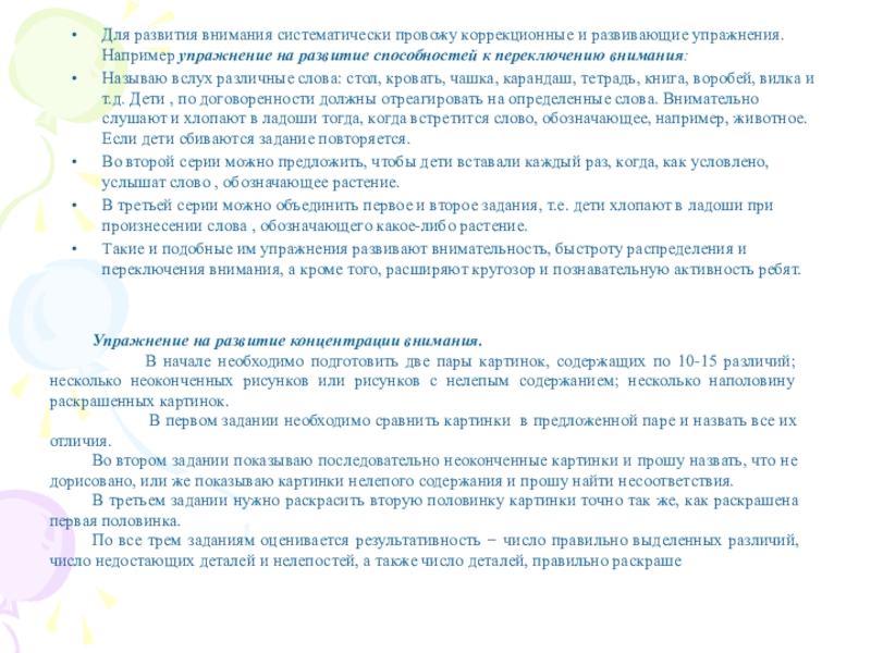 По все трем заданиям оценивается результативность – число правильно выделенных различий, число недостающих деталей и нелепостей, а также число деталей, правильно раскраше