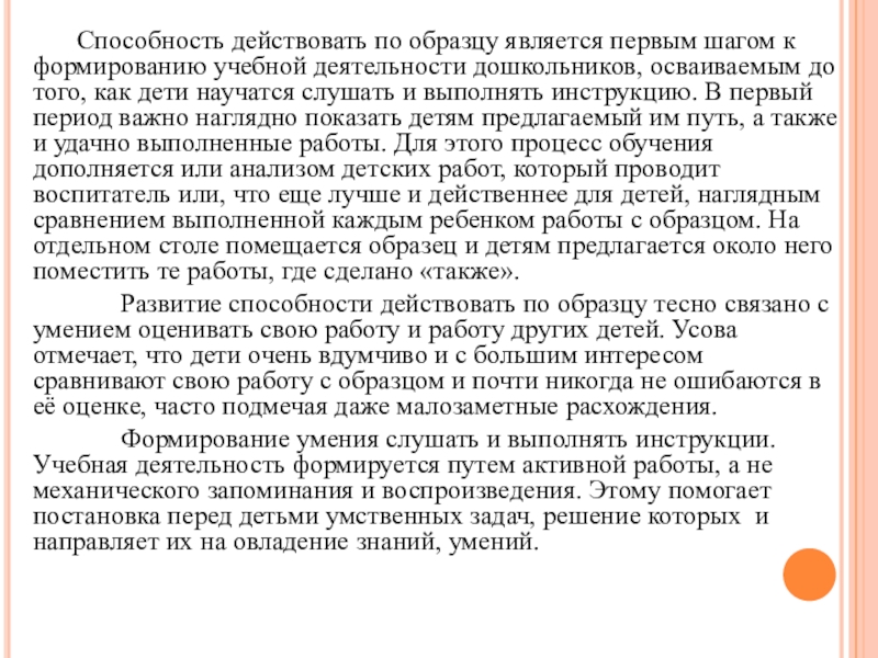 Развитие способности действовать по образцу тесно связано с умением оценивать свою работу и работу других детей. Усова отмечает, что дети очень вдумчиво и с большим интересом сравнивают свою работу с образцом и почти никогда не ошибаются в её оценке, часто подмечая даже малозаметные расхождения.