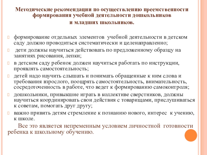 Слайд 13Методические рекомендации по осуществлению преемственности формирования учебной деятельности дошкольников