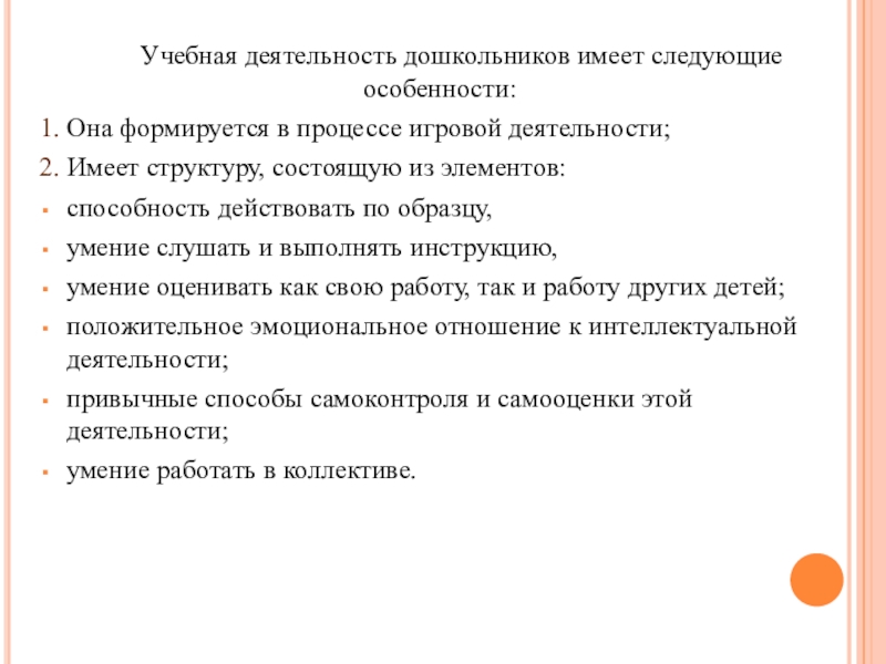 Слайд 11 Учебная деятельность дошкольников имеет следующие особенности: