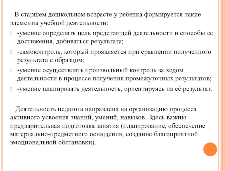 Слайд 8 В старшем дошкольном возрасте у ребенка формируется такие элементы учебной
