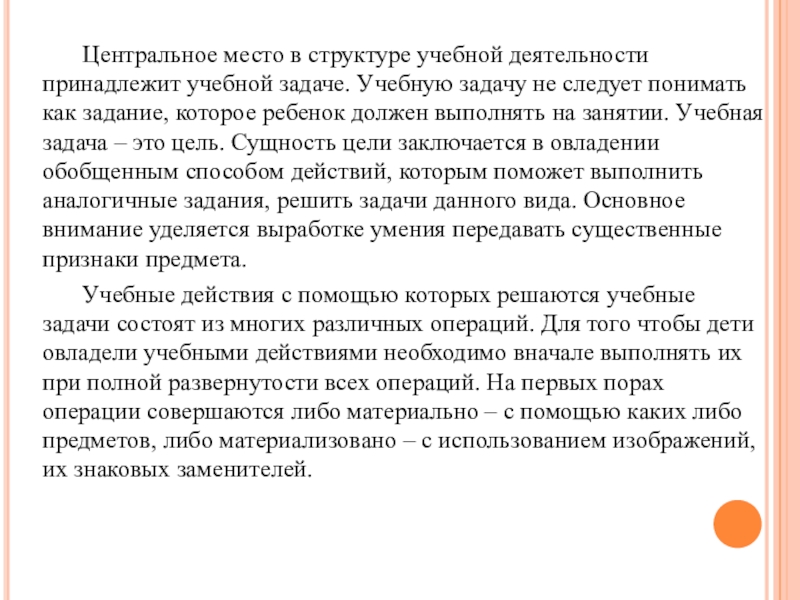Слайд 5 Центральное место в структуре учебной деятельности принадлежит учебной задаче. Учебную задачу