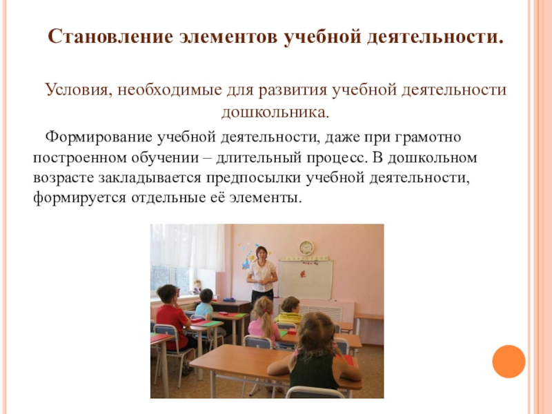 Формирование учебной деятельности, даже при грамотно построенном обучении – длительный процесс. В дошкольном возрасте закладывается предпосылки учебной деятельности, формируется отдельные её элементы.