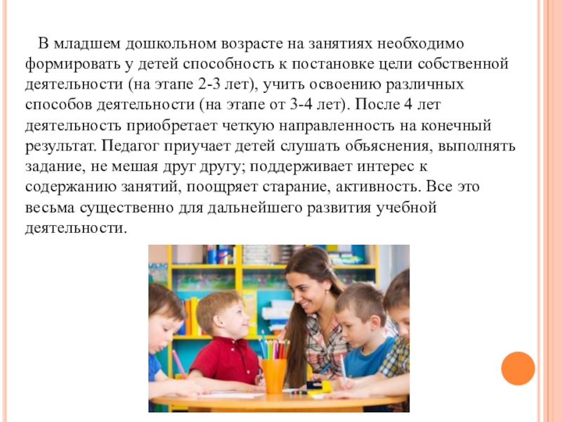 детей способность к постановке цели собственной деятельности (на этапе 2-3 лет), учить освоению различных способов деятельности (на этапе от 3-4 лет). После 4 лет деятельность приобретает четкую направленность на конечный результат. Педагог приучает детей слушать объяснения, выполнять задание, не мешая друг другу; поддерживает интерес к содержанию занятий, поощряет старание, активность. Все это весьма существенно для дальнейшего развития учебной деятельности.