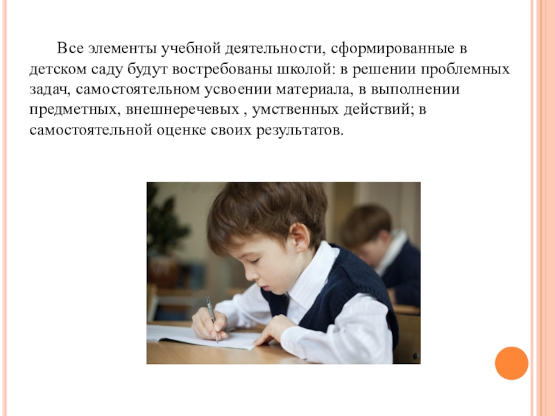 Слайд 12 Все элементы учебной деятельности, сформированные в детском саду будут востребованы школой:
