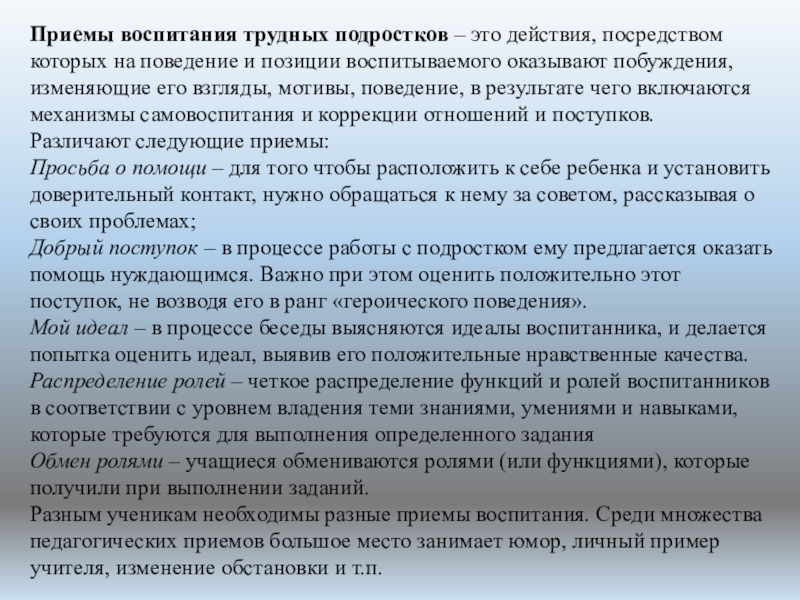Слайд 10Приемы воспитания трудных подростков – это действия, посредством которых на поведение