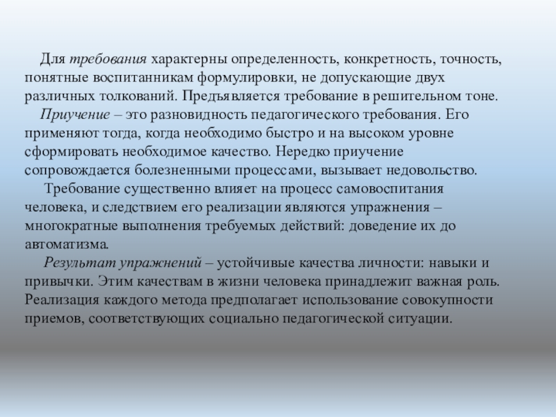 Требование существенно влияет на процесс самовоспитания человека, и следствием его реализации являются упражнения – многократные выполнения требуемых действий: доведение их до автоматизма.