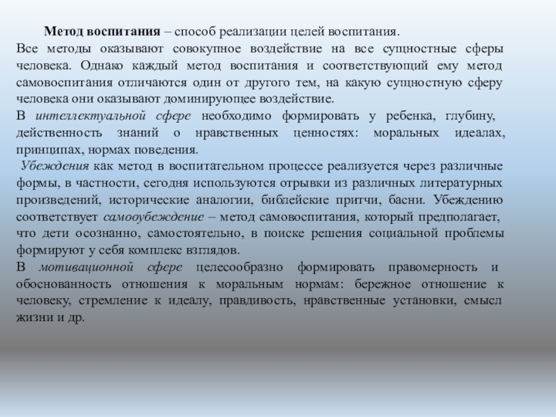 методы оказывают совокупное воздействие на все сущностные сферы человека. Однако каждый метод воспитания и соответствующий ему метод самовоспитания отличаются один от другого тем, на какую сущностную сферу человека они оказывают доминирующее воздействие.