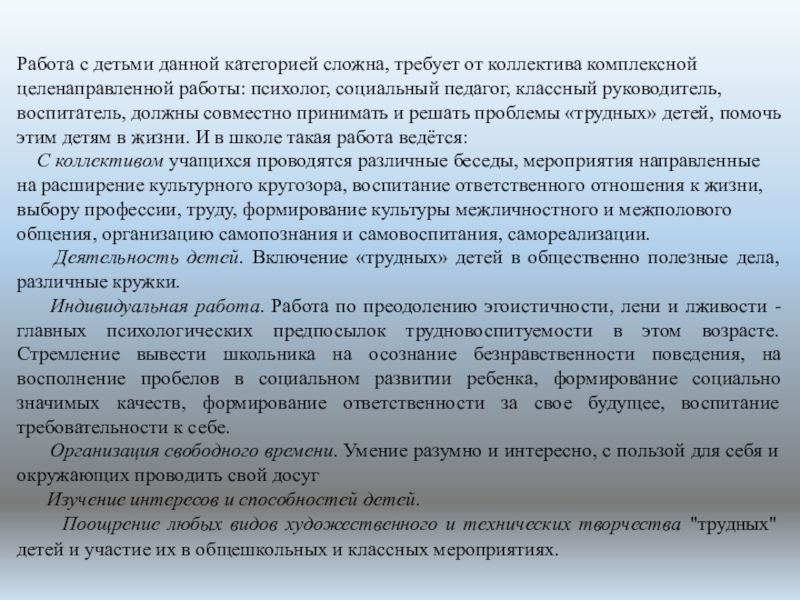Слайд 11Работа с детьми данной категорией сложна, требует от коллектива комплексной целенаправленной