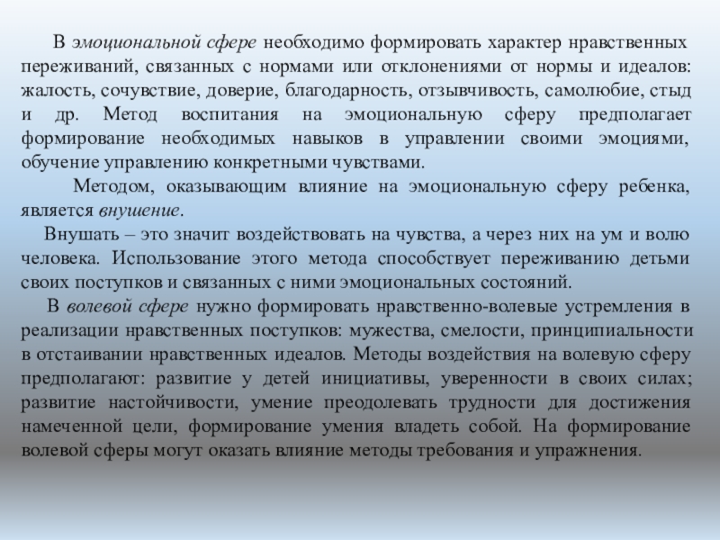 связанных с нормами или отклонениями от нормы и идеалов: жалость, сочувствие, доверие, благодарность, отзывчивость, самолюбие, стыд и др. Метод воспитания на эмоциональную сферу предполагает формирование необходимых навыков в управлении своими эмоциями, обучение управлению конкретными чувствами.