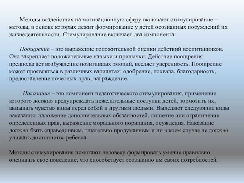 Методы стимулирования помогают человеку формировать умение правильно оценивать свое поведение, что способствует осознанию им своих потребностей.
