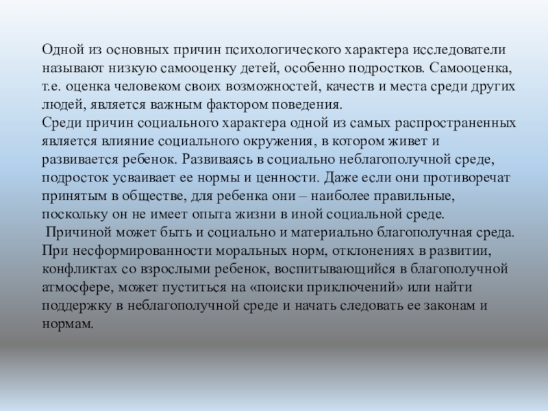 Среди причин социального характера одной из самых распространенных является влияние социального окружения, в котором живет и развивается ребенок. Развиваясь в социально неблагополучной среде, подросток усваивает ее нормы и ценности. Даже если они противоречат принятым в обществе, для ребенка они – наиболее правильные, поскольку он не имеет опыта жизни в иной социальной среде.