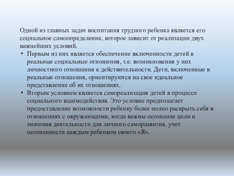Слайд 5Одной из главных задач воспитания трудного ребенка является его социальное самоопределение,