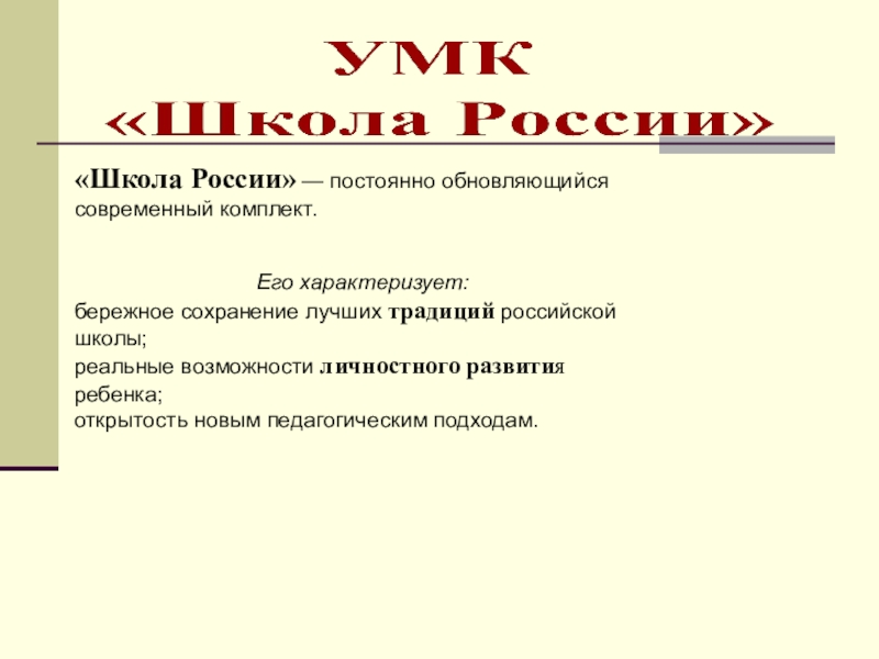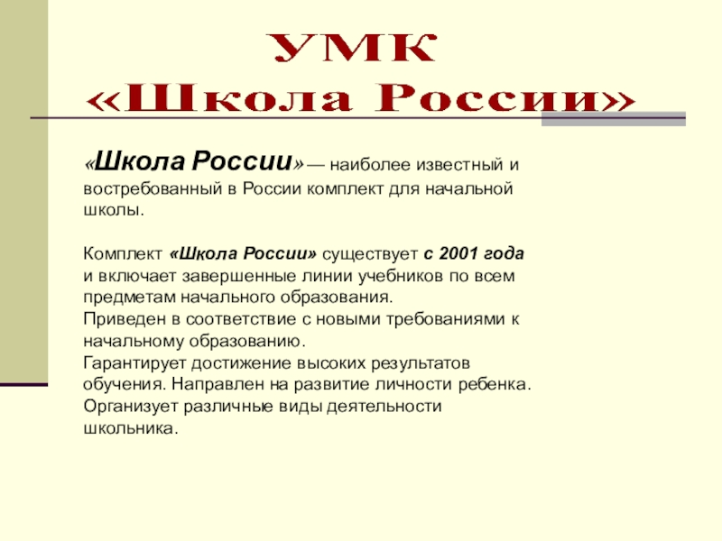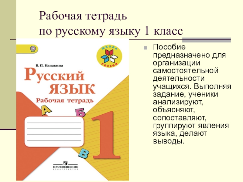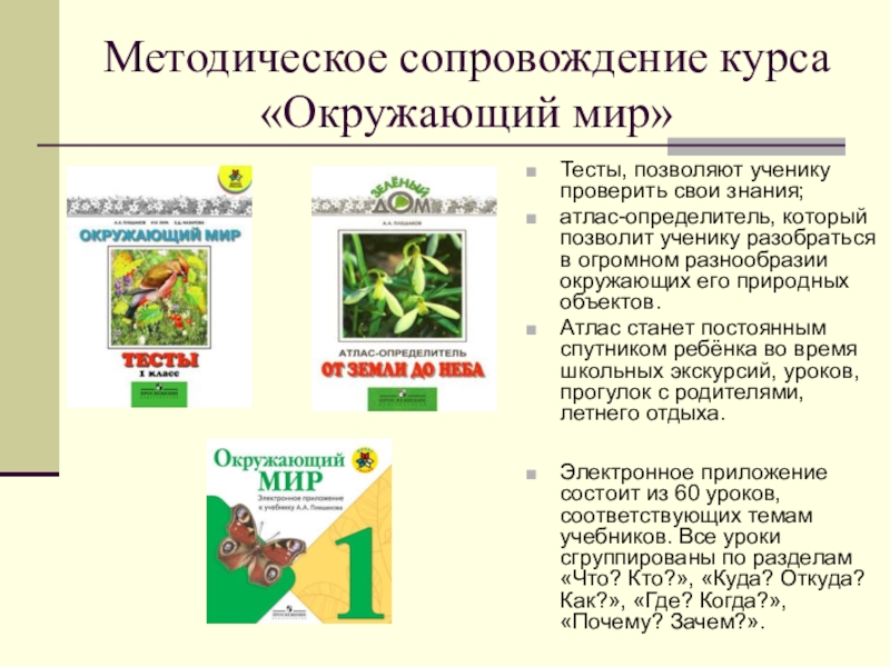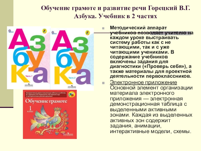 Методический аппарат учебников позволяет учителю на каждом уроке выстраивать систему работы как с не читающими, так и с уже читающими учениками. В содержание учебников включены задания для диагностики («Проверь себя»), а также материалы для проектной деятельности первоклассников.