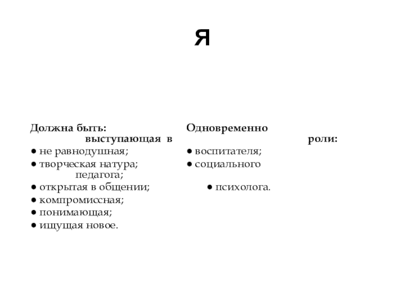 Я   Должна быть: Одновременно выступающая в роли:● не равнодушная; ● воспитателя;● творческая натура; ● социального педагога;● открытая в общении; ● психолога. ● компромиссная; ● понимающая; ● ищущая новое.