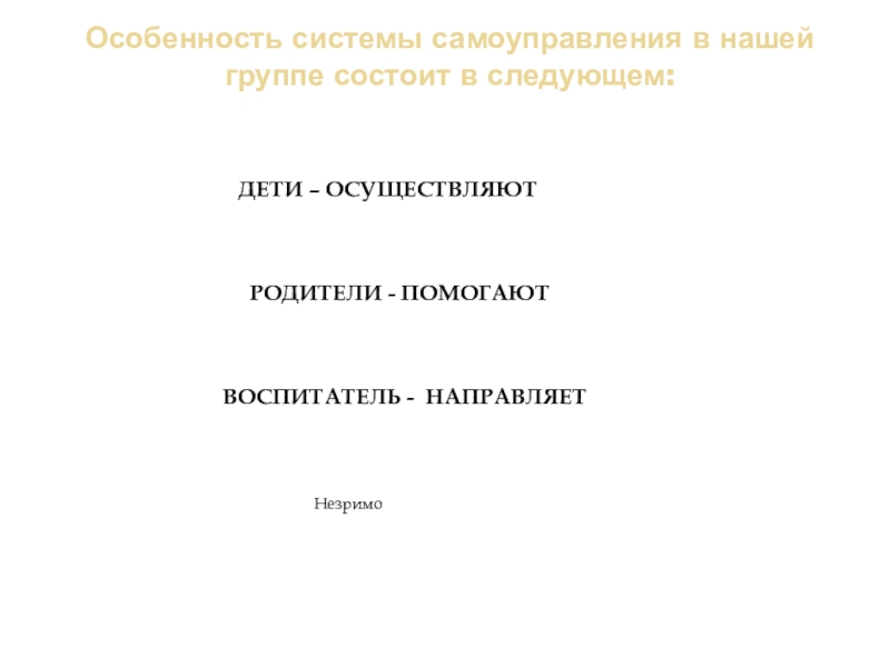 Слайд 3Особенность системы самоуправления в нашей группе состоит в следующем: