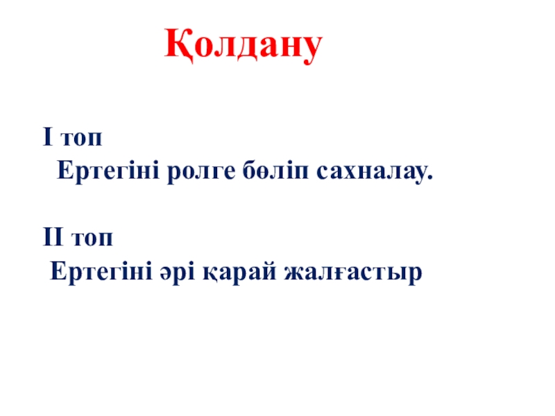 І топ Ертегіні ролге бөліп сахналау.ІІ топ Ертегіні әрі қарай жалғастырҚолдану