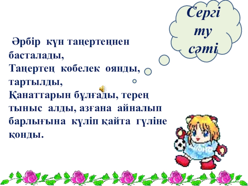 Сергіту сәті Әрбір күн таңертеңнен басталады,Таңертең көбелек оянды, тартылды,Қанаттарын бұлғады, терең тыныс алды, азғана айналып барлығына күліп