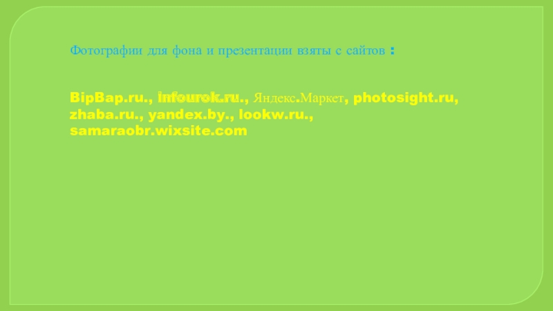 Фотографии для фона и презентации взяты с сайтов :BipBap.ru., infourok.ru., Яндекс.Маркет, photosight.ru, zhaba.ru., yandex.by., lookw.ru., samaraobr.wixsite.com