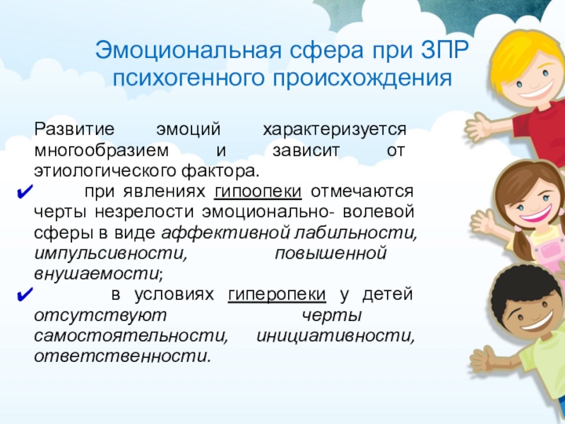 Слайд 8Эмоциональная сфера при ЗПР психогенного происхождения