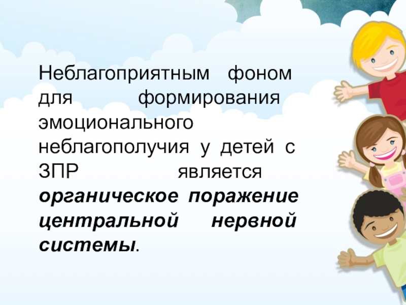Слайд 4Неблагоприятным фоном для формирования эмоционального неблагополучия у детей с ЗПР является