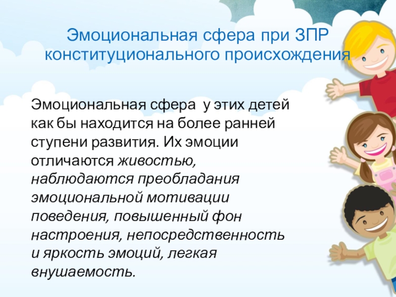 Слайд 6Эмоциональная сфера при ЗПР конституционального происхождения