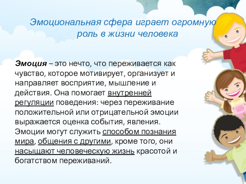Эмоциональная сфера играет огромную роль в жизни человекаЭмоция – это нечто, что переживается как чувство, которое мотивирует, организует и направляет восприятие, мышление и действия. Она помогает внутренней регуляции поведения: через переживание положительной или отрицательной эмоции выражается