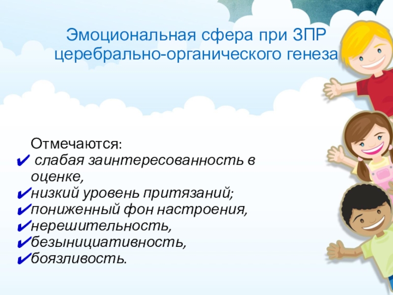 Эмоциональная сфера при ЗПР церебрально-органического генезаОтмечаются: слабая заинтересованность в оценке, низкий уровень притязаний; пониженный фон настроения,нерешительность, безынициативность,