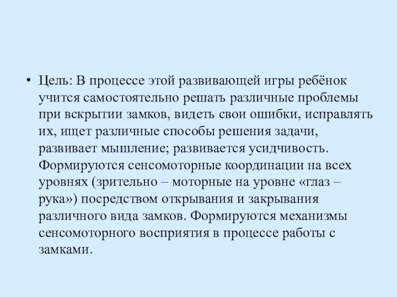 проблемы при вскрытии замков, видеть свои ошибки, исправлять их, ищет различные способы решения задачи, развивает мышление; развивается усидчивость. Формируются сенсомоторные координации на всех уровнях (зрительно – моторные на уровне «глаз – рука») посредством открывания и закрывания различного вида замков. Формируются механизмы сенсомоторного восприятия в процессе работы с замками.