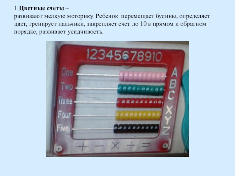 развивают мелкую моторику. Ребенок перемещает бусины, определяет цвет,