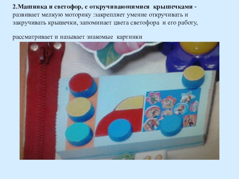 2.Машинка и светофор, с откручивающимися крышечками - развивает мелкую моторику :закрепляет