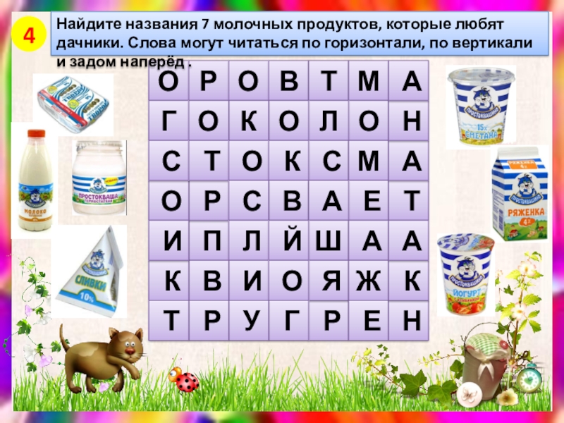 Найдите названия 7 молочных продуктов, которые любят дачники. Слова могут читаться по горизонтали, по вертикали и задом наперёд .