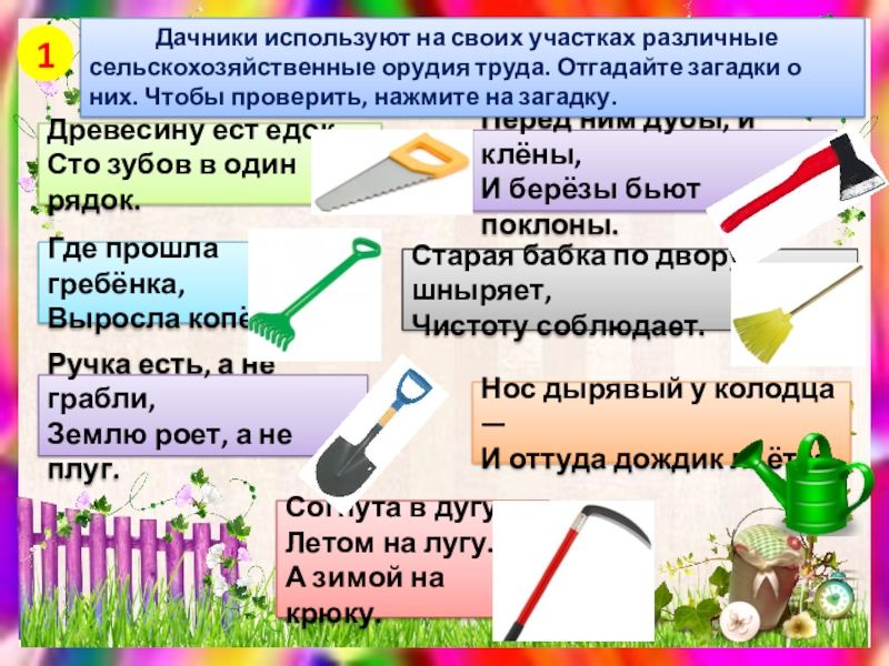 Дачники используют на своих участках различные сельскохозяйственные орудия труда. Отгадайте загадки о них. Чтобы проверить, нажмите на загадку.