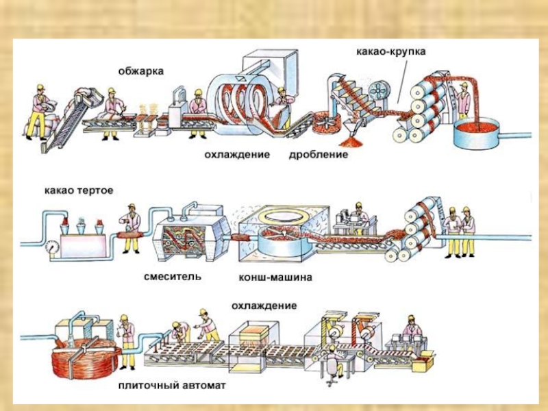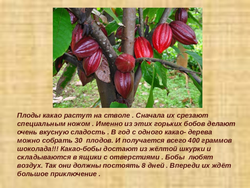 . Именно из этих горьких бобов делают очень вкусную сладость . В год с одного какао- дерева можно собрать 30 плодов. И получается всего 400 граммов шоколада!!! Какао-бобы достают из жёлтой шкурки и складываются в ящики с отверстиями . Бобы любят воздух. Так они должны постоять 8 дней . Впереди их ждёт большое приключение .