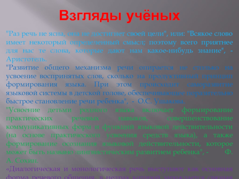 "Усвоение детьми родного языка включает формирование практических речевых навыков, совершенствование коммуникативных форм и функций языковой действительности (на основе практического усвоения средств языка), а также формирование осознания языковой действительности, которое может быть названо лингвистическим развитием ребенка", - Ф.А. Сохин.