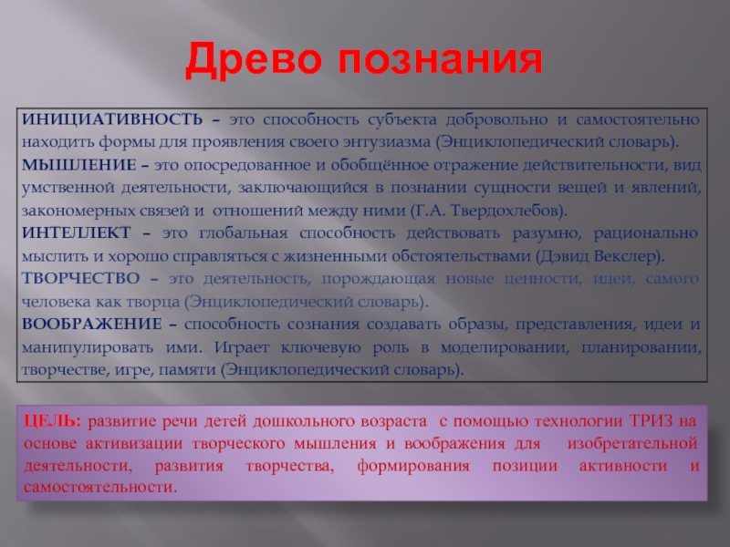 Древо познанияЦЕЛЬ: развитие речи детей дошкольного возраста с помощью технологии ТРИЗ на основе активизации творческого мышления и
