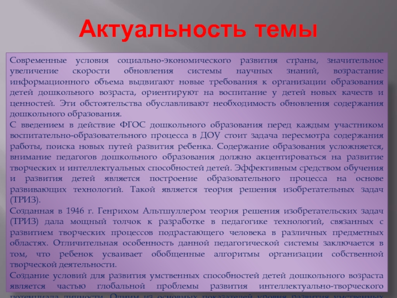 Актуальность темыСовременные условия социально-экономического развития страны, значительное увеличение скорости обновления системы научных знаний, возрастание информационного объема выдвигают новые требования к организации образования детей дошкольного возраста, ориентируют на воспитание у детей новых качеств и ценностей. Эти обстоятельства