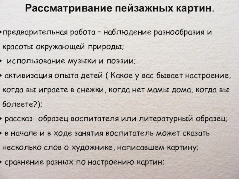 (здесь ведется работа по развитию умения выделять в картине самое существенное, а также обучение видеть ее детали, описывать фон, пейзаж);
