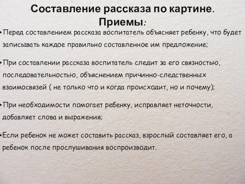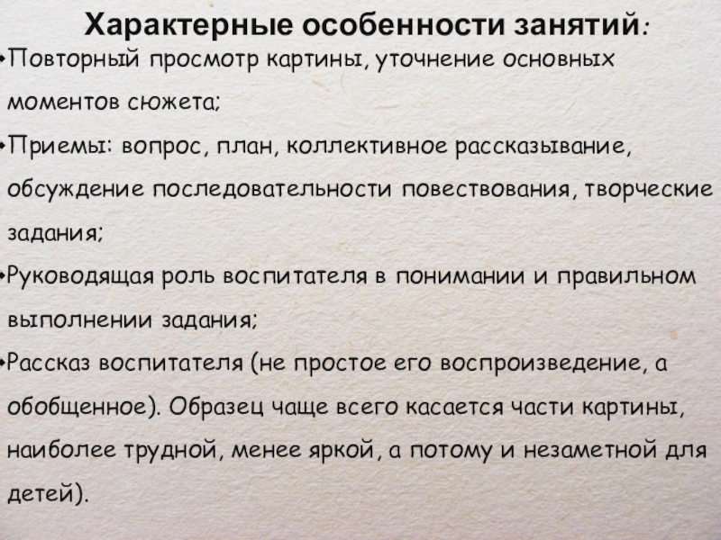Рассказ воспитателя (не простое его воспроизведение, а обобщенное). Образец чаще всего касается части картины, наиболее трудной, менее яркой, а потому и незаметной для детей).