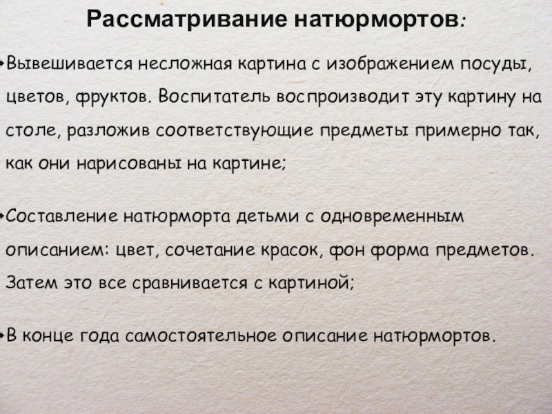 Составление натюрморта детьми с одновременным описанием: цвет, сочетание красок, фон форма предметов. Затем это все сравнивается с картиной;