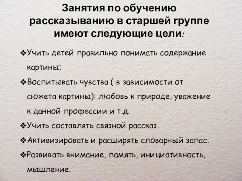 Слайд 4Занятия по обучению рассказыванию в старшей группе имеют следующие цели: