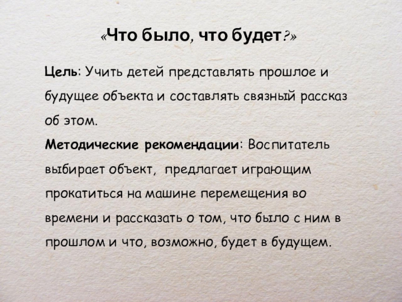 Методические рекомендации: Воспитатель выбирает объект, предлагает играющим прокатиться на машине перемещения во времени и рассказать о том, что было с ним в прошлом и что, возможно, будет в будущем.