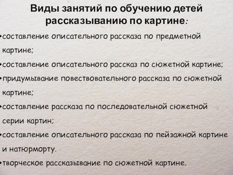 Слайд 6Виды занятий по обучению детей рассказыванию по картине: