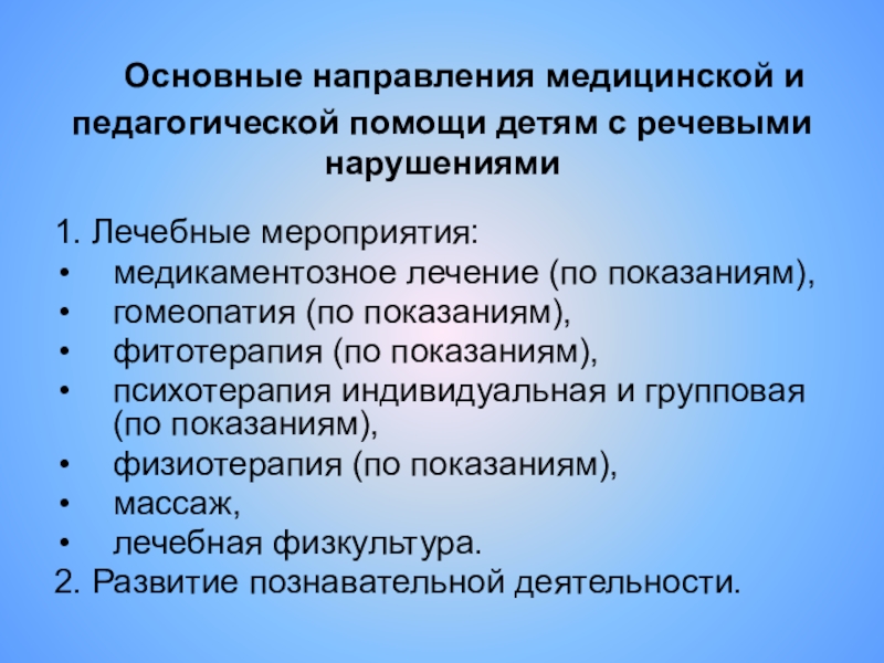 Слайд 14 Основные направления медицинской и педагогической помощи детям с речевыми нарушениями