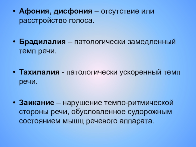 Слайд 9Афония, дисфония – отсутствие или расстройство голоса.