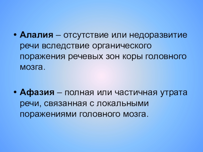 Слайд 11Алалия – отсутствие или недоразвитие речи вследствие органического поражения речевых зон