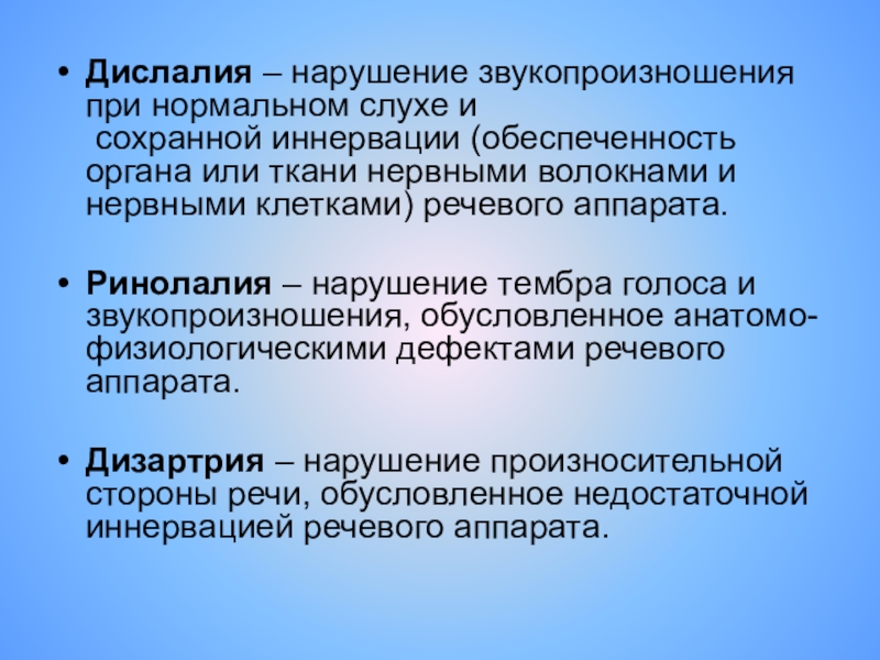 Слайд 10Дислалия – нарушение звукопроизношения при нормальном слухе и