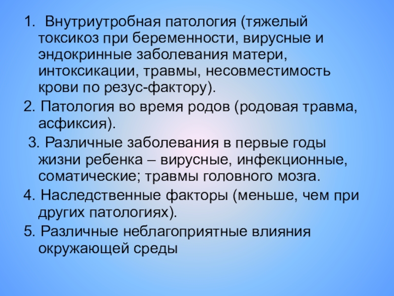 Слайд 61. Внутриутробная патология (тяжелый токсикоз при беременности, вирусные и эндокринные заболевания