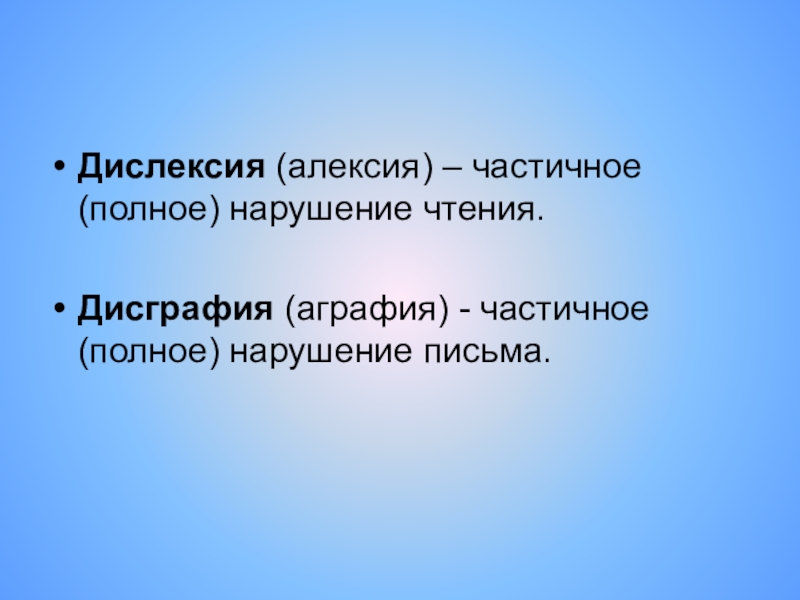 Дислексия (алексия) – частичное (полное) нарушение чтения.